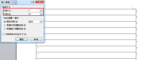2、在打开的表格设置框中,把列数调整为1,根据自己的喜好设置行数,比如25,“确定”。用鼠标在右下角等控制点出现时把表格拉满整页。