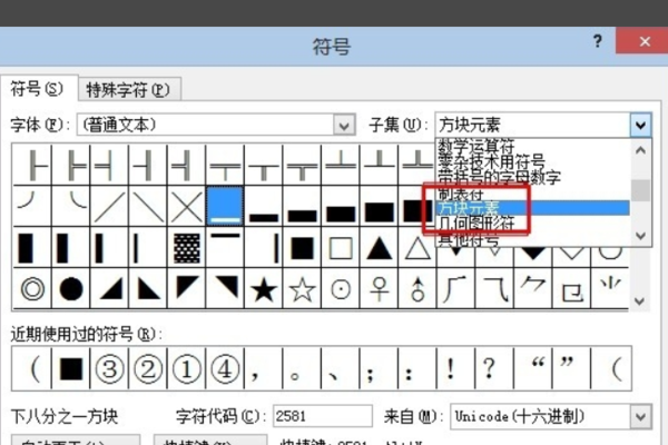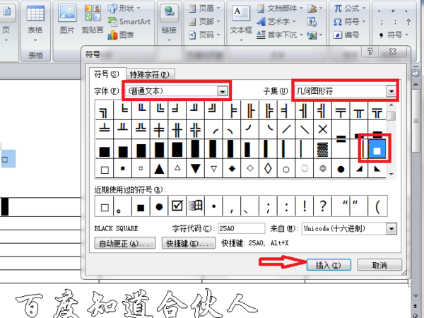 4、在弹出的对话框中,字体栏中选普通文本,然后点击“子集”后的下拉按钮,选择“几何图形符”,之后在下面框中找到实心黑色小框插入。