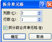3、弹出拆分单元格对话框,在列数的输入框中输入:2 ;