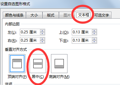 不改变文本框大小的设置。不改变文本框大小让文字在竖排文本框中水平居中对齐,可参照上图,设置“内部边距”的左、右边距就可以了。