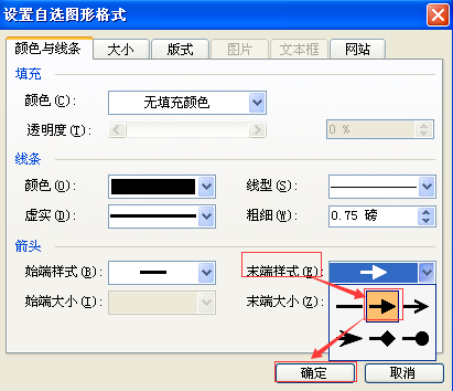 4、在弹出的“设置自选图形格式”对话框中点击“箭头”下的“末端样式”,选择一个合适的箭头,点击“确定”即可。