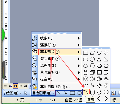 1、点击绘图工具上的“自选图形”,光标移至“基本形状”上,点击下拉菜单中的“弧形”图标;