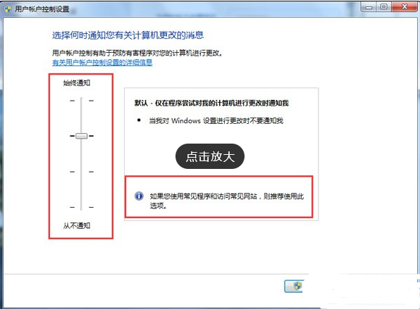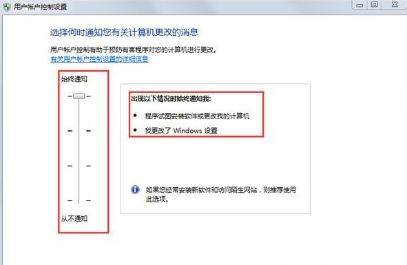 更改用户账户控制:查看“用户账户控制”,会发现左侧的滑块处于顶部“始终通知”,看右边的说明,也就是说这个设置无论是安装软件还是对电脑中的文件进行操作时,都会进行通知,把滑块下拉,根据需要选择合适的设置即可。