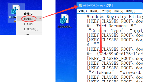 2、右击addword.reg,选择编辑,系统自动用记事本打开文件,然后 复制以下代码到窗口中: