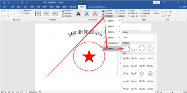 10.点击文本效果下的装换,然后在选择拱形;