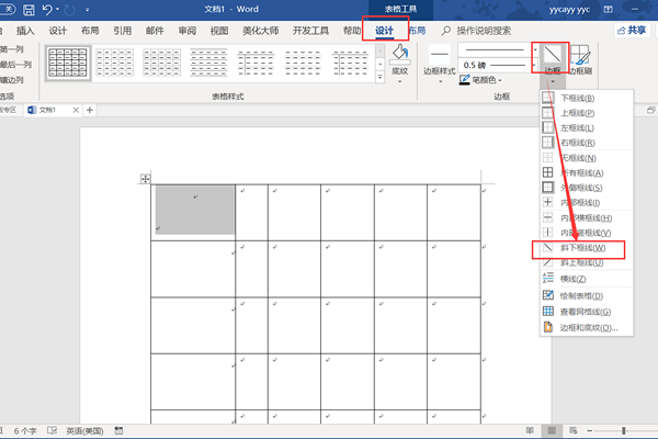 2、鼠标依次点击 “表格工具”,“设计”,点击“边框”,展开下拉菜单,找到并且点击“斜下框线”按钮。