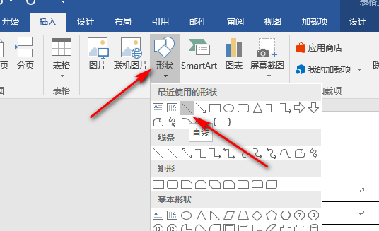 2、插入表格之后,点击插入形状,选择直线。