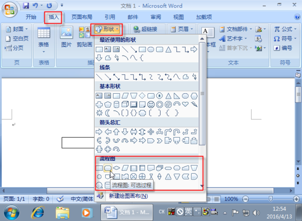 5、选择主菜单栏里的“插入”,点开“形状”下拉菜单,选择“流程图”中的任意一个形状: