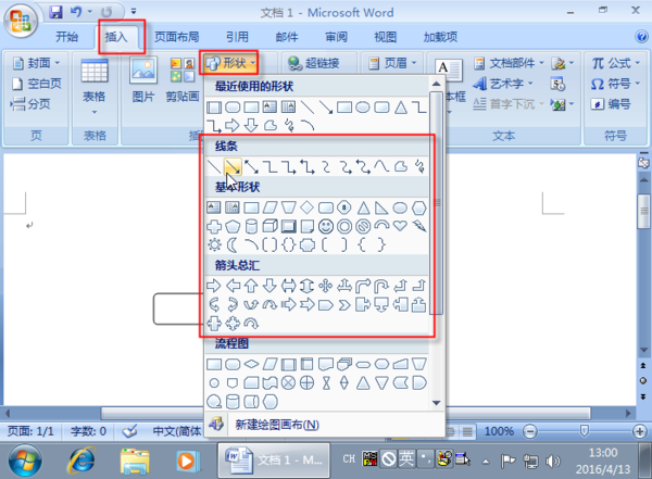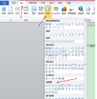 1、选择插入菜单——选择形状——选择制作流程图需要用到的形状图形。