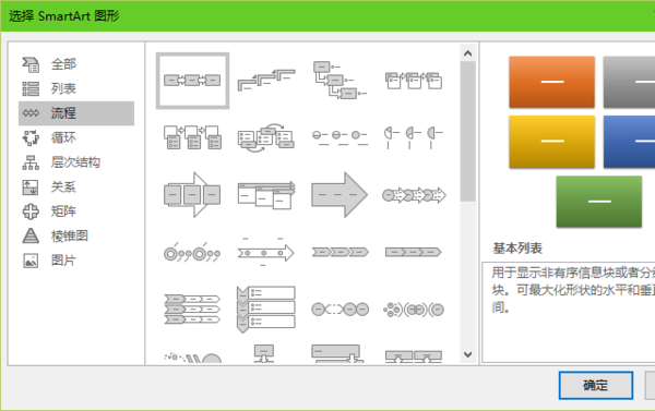 在弹出的“选择 SmartArt 图形”对话框,在左侧类别中点击“流程”分类,然后在中间的列表中,选择一种适合的。