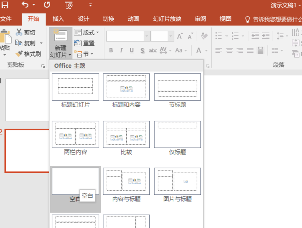 新建空白演示文档,“新建幻灯片”——“空白”。