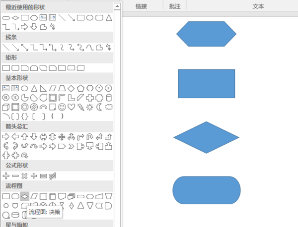 依次点击“插入”选项卡——“插图”组—— 形状,在下拉菜单中点选“流程图”中的图形。流程图的各个形状,都有其特定的含义,比如矩形是“过程”,六边形是“准备”,菱形是“决策”,等等。了解它们的含义,可以画出更专业的流程图。