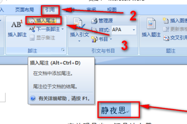 2、选中“静夜思”,然后选择“引用”,选择“插入尾注”。