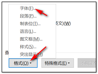 4、点击以后,在“查找”的界面内的下方选择并点击“格式”选项中的“字体”;