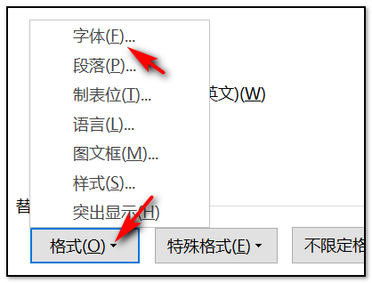 6、同理在替换的界面下方选择并点击“格式”选项中的“字体”;