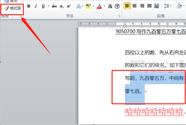 3、按住鼠标左键在需要改变的文字上刷一遍,就会变成和刚刚选取的文字一样的格式了。