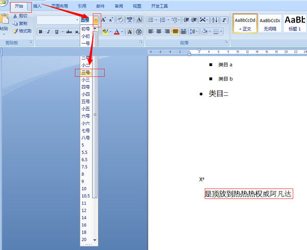 选中区域——开始——字体大小下拉——选择字号,如图: