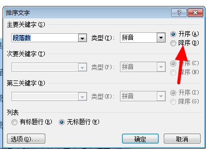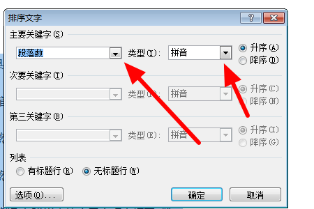 第三、最后我们在“排序文字”对话框中的“主要关键字”下,点击“段落数”和“拼音”,然后点击“升序”或“降序”即可。