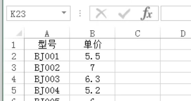 2、在工作表SHEET2的A列和B列中输入型号与单价数据。
