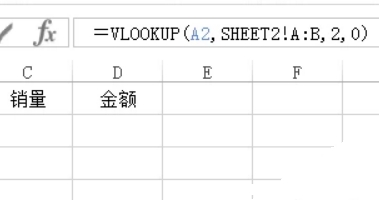 4、然后,在编辑栏中输入:=VLOOKUP(A2,SHEET2!A:B,2,0)。