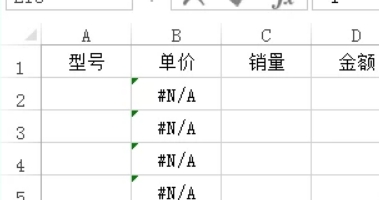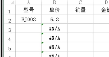 6、不要紧的,因为A列中还没有输入任何型号,所以,B列显示这个符号。我们现在开始输入型号,比如,在A2单元格输入SHEET2工作A列中任意型号;那么,在B2单元格自动显示了该型号的对应单价。
