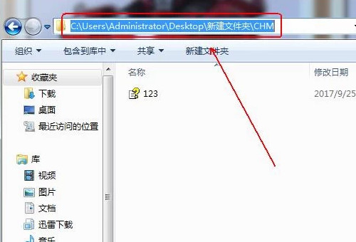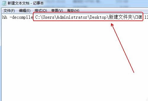 4、输入下列语句:hh -decompile C:\Users\Administrator\Desktop\新建文件夹\CHM 123.chm(下图红框中语句的意思是需要转换的chm文件转换后需要储存的位置,可以自定义)