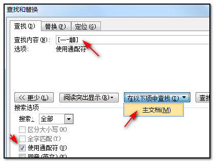 4、在弹出的对话框中,查找栏里输入”[一-龥]“,并勾选”使用通配符“同时选择主文档;