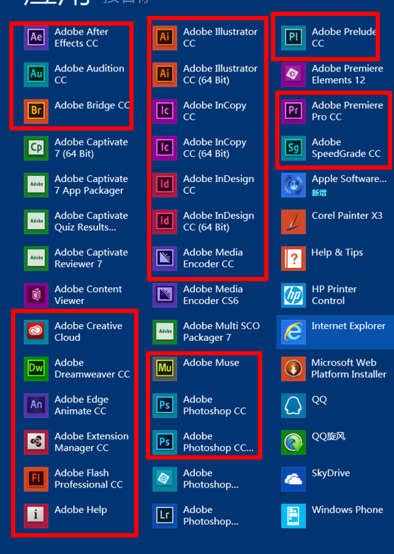 红框圈的是CC系列软件,看图标,上面就是简称,从头开始,AE是做电影特效的;AU是做音乐合成的;BR是用来管理文件的;CC那个去图标就是云端,管理所有CC系列软件的,更新,卸载管理云文件等;DW是做网站的;AN也是做网页的;EM是管理CC系列软件扩展功能的;FL是专业做FLASH动画的;下面的是ADOBE帮助程序;两个AI分别是32位与64位,是平面设计中做适量绘画的;IC与ID是专业的排版工具;ME是格式转换器;MU也是做网站的;PS我不说也都知道,专业图像合成软件;PL软件好像是影视素材编辑(这个不太熟悉);PR是视频剪辑软件;SG是调色软件。能力有限,就知道这些了。