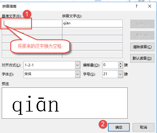 3、此时软件会为该汉字注音,然后在基准文字下将原来的“汘”删除,再录入一个空格符,然后点击确定。