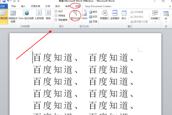 1、打开需要操作的WORD文档,点击视图标签页中的“显示比例”进入相关设置界面。