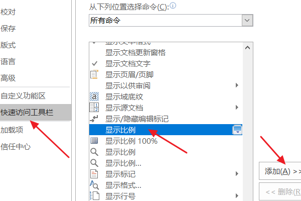3、点击“快速访问工具栏”,再命令中找到“显示比例”,点击添加按钮。