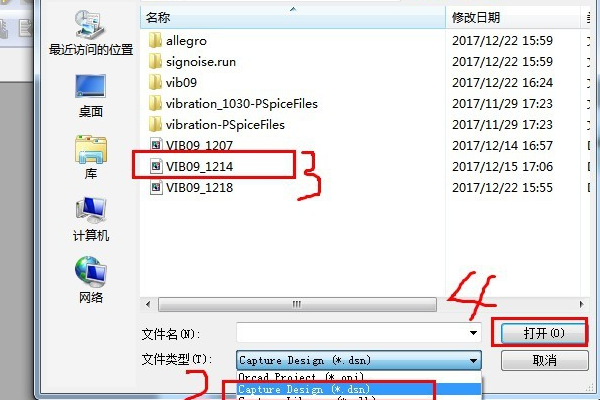 1、首先打开计算机,然后在计算机内打开cadence界面内,在界面内点击open,按照图示方法打开DSN文件。