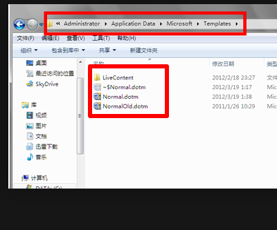 4、然后我们在地址栏上输入“C:\Documents and Settings\Administrator\Application Data\Microsoft\Templates”,之后将Normal字样的文件全部删掉即可。