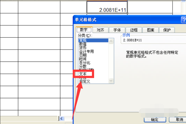 4、点击设置单元格格式后,弹出下图所示的页面,点击数字,然后找到文本。
