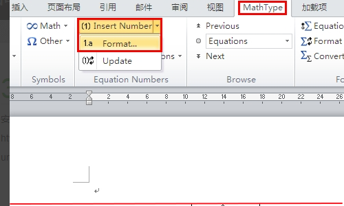 2、安装过Mathtype软件后,Word会有一个Mathtype的模块,我们选择该模块下的“Insert Number”->“Format”,设置一下编号的格式。