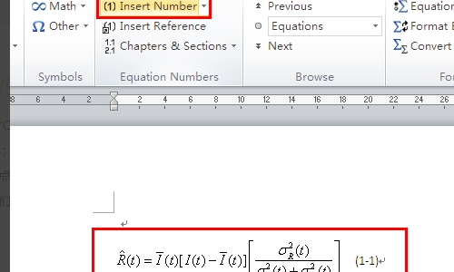 4、将光标放在需要编号的公式后,直接点击“Insert Number”按钮,公式就会按照我们之前设置的格式进行编号了。