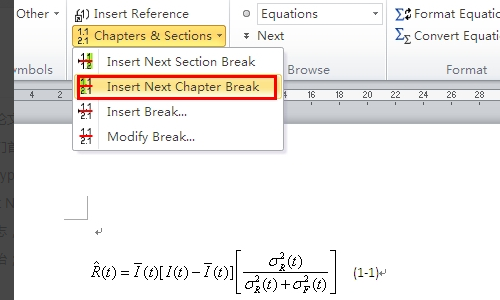 5、在该章节的一个空白处点击Mathtype模块中的“Chapters & Sections”->“Insert Next Chapter Break”,插入一个章节结束标志,为下一章的公式,编号从新开始。