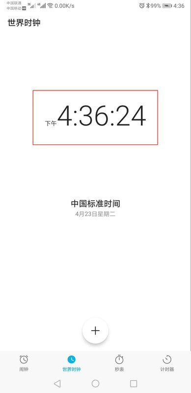 3、进入华为荣耀note10手机世界时钟界面后,可以看到此时手机时钟只显示几时几分,如下图所示。