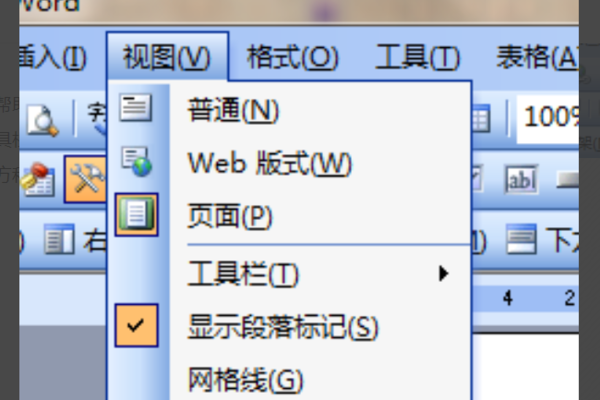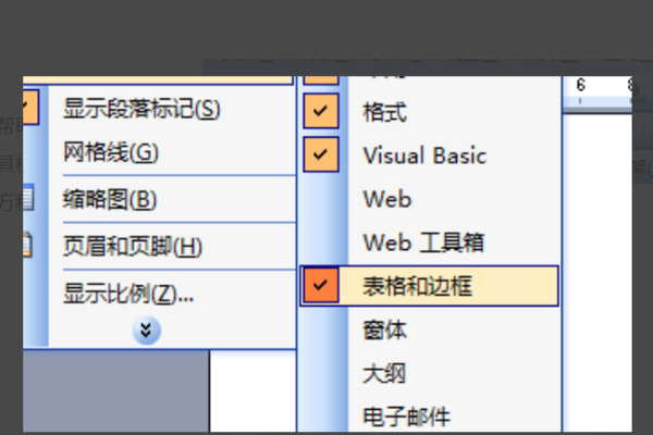 (2) 在“视图”菜单中选择"工具栏",在菜单中选择“表格和边框”或将“表格和边框”前的对勾去掉