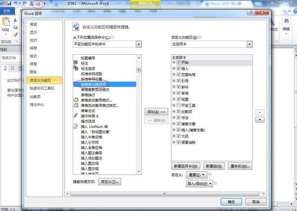 照猫画虎,我也点开了word 选项,选择了“自定义功能区”和“不在功能区中的命令”,找到了里面的“表格单元格选项”。但是左上角快速工具栏是指哪些?怎样才能 ”把一些功能加到左上角快速工具栏中“呢?