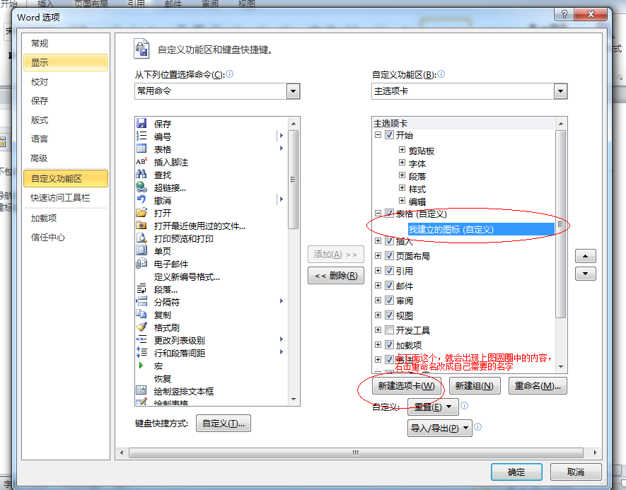 怎样新建一个自定义区”?又怎样“把表格选项加到自己新建的自定义区“?
