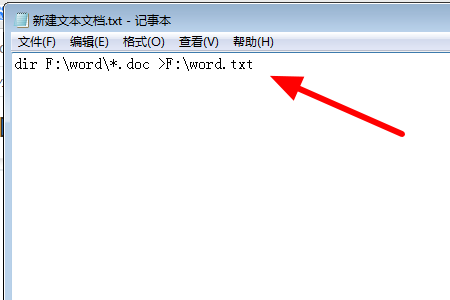 3、然后点击打开文本文档,输入:dir F:\word\*.doc >F:\word.txt。