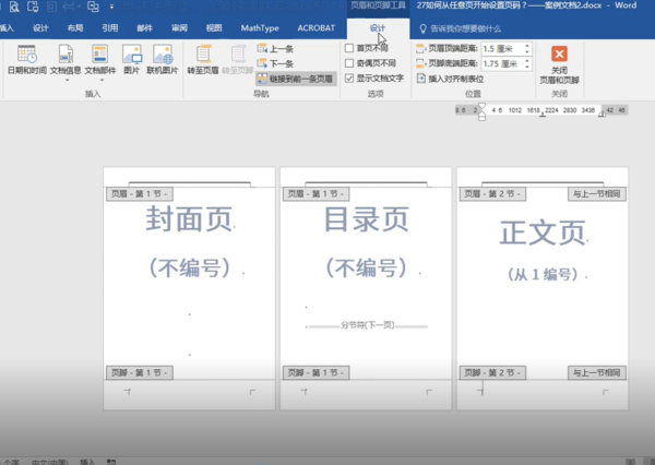 2、需要断开节与节之间的链接。双击页脚部分,出现页眉与页脚工具选项卡,单击取消-链接到前一条页眉。