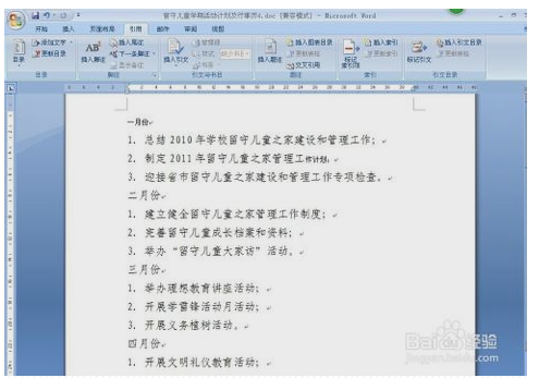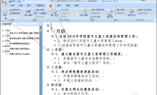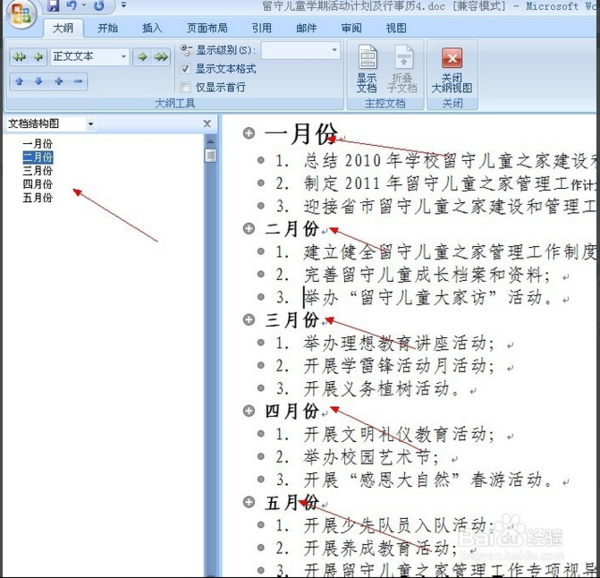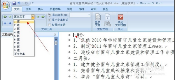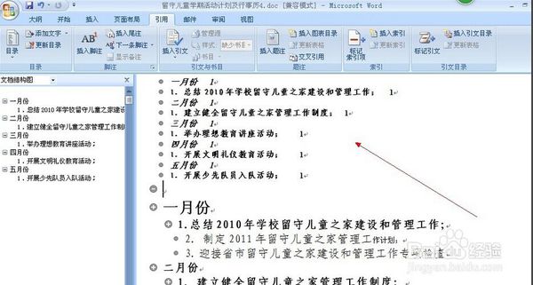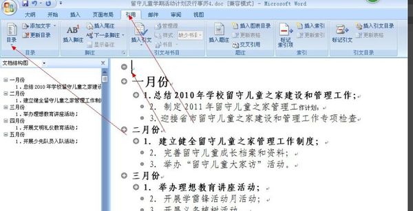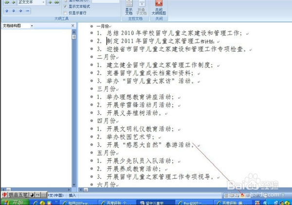3、 然后把光标停留在一级目录的前方,点击左上方的一级目录,比如。我们把一月份、二月份、三月份。。。。。。等作为一级目录,如图