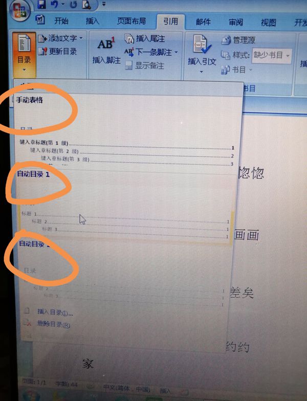 2.执行菜单命令“引用/目录”选中目录格式“手动或者自动”对话框;