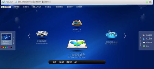 樽槌桑荷堂秤教ā⑺阉饕媾琶呕I堂秤教?槭且豢疃喙δ茏酆瞎愀嫘畔⑷悍⑷砑,在对外发布广告信息的同时建立高质量稳定的外链接,从而达到信息推广的效果并辅助网站在搜索引擎排名的提升。而搜索引擎排名优化模块主要是针对百度、google、雅虎等多种中英文搜索引擎,通过建立大量高质量和稳定外链接的一款搜索引擎排名优化工具。在提高搜索引擎排名的同时将企业营销信息发送到各大博客网站,从而达到推广的效果。商贸营销平台模块包括:黄页群发、分类信息群发、企业博客群建、邮件群发4大群发功能,主要是针对企业营销信息的推广,引导企业通过互联网宣传产品,寻找客户,实现网络推广。在对外发布广告信息的同时建立高质量稳定的外链接,从而达到信息推广的效果并辅助网站在搜索引擎排名的提升。搜索引擎排名优化模块包括:主流博客群建、XSPACE博客群建、SNS博客群建、LXBLOG博客群建、英文主流博客群建5大博客群建功能。主要是针对大型门户网站、Wordpress博客、社区个人门户系统、SNS社区(社会性网络)网站、LXBLOG(多用户博客系统)博客。通过对五种类型博客网站进行博客群建和自动群发文章,通过建立大量高质量和稳定外链接方式达到提高搜索引擎排名效果。在提高搜索引擎排名的同时将企业营销信息发送到各大博客网站,从而达到推广的效果。 "商贸营销平台模块+搜索引擎排名优化模块"是SKYCC营销软件的特色,两模块相结合的模式,相辅相成的效果,给客户带来更多的利益,和更大的商业价值! SKYCC营销软件2009根据不同搜索引擎的不同特点和软件的功能的分配,特推出以下更具争对性和高效性组合: ①、商贸营销平台+搜索引擎排名优化:主要针对百度、GOOGLE、YAHOO等搜索引擎和全方位的企业广告信息推广。