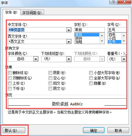 第2步,在打开的“字体”对话框中分别选择中文字体和西文字体,并单击“默认”按钮。