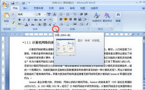 1、打开Word 2007文档,在“开始”功能区的“字体”分组中单击显示字体对话框按钮。