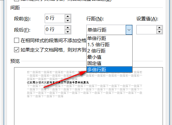 4、在新打开的界面中的下拉菜单中选择“多倍行距”。