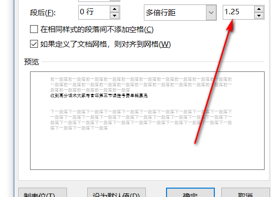 5.输入完毕后找到下方确定选项,点击该选项即可成功设置1.25倍行距,如下图所示。
